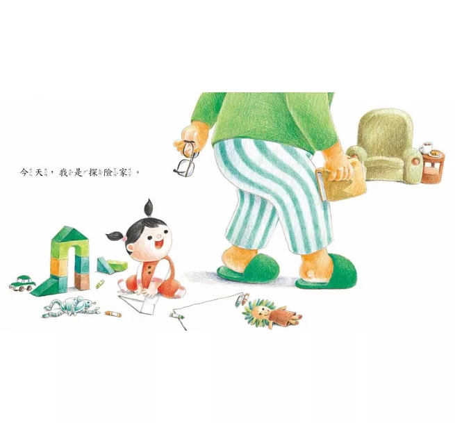 每個成長中的孩子,對家中男性長輩,總是帶著一份敬畏之心,同時,又像一個可以隨意陪你玩耍看世界的巨人。書中,爸爸看似無關緊要的在做自己的事情,其實,注意細看他的眼神和小動作,在在透露著關愛的心。